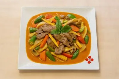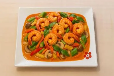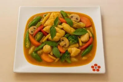 | 2 pièces scampi, poivrons, pousses de bambou, oignons, carottes, champignons, maïs, gombos, basilic, curry, lait de coco et ciboulette | |||