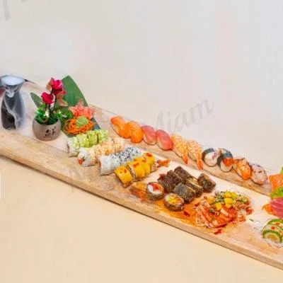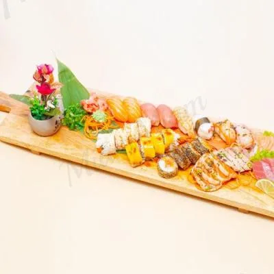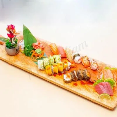 | 48 pièces - saumon, thon, crevette, tempura scampi, poulpe, saint-jacques, saumon mi-cuit et thon mi-cuit | ||||